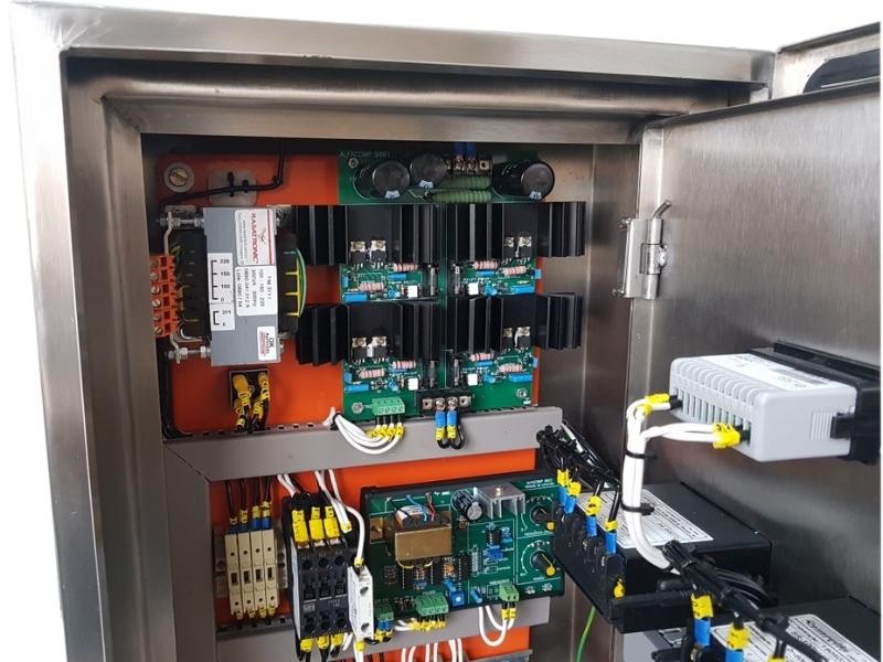 O sinal elétrico é obtido pela retificação da energia elétrica da rede obtendo-se, assim, tensão contínua que então é novamente transformada em tensão alternada pela utilização de circuito de chaveamento dotado de transistores de efeito de campo de potência.