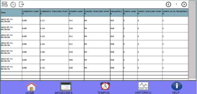 Ao selecionar a tela de históricos você terá acesso ao registro de todas as variáveis utilizadas para cada insensibilização, toda vez que o garfo é acionado você tem o registro de corrente do garfo, corrente no terceiro ponto, tensão do garfo, tensão do terceiro ponto, frequência, tempos selecionados, data e hora.