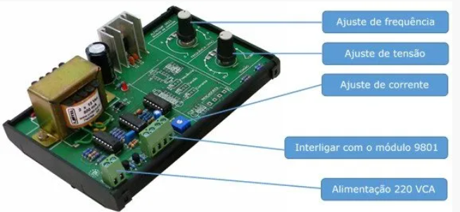 A figura a seguir apresenta a um esquemático básico para a montagem de um insensibilizador de suínos utilizando os módulos 2022 e 9801.
