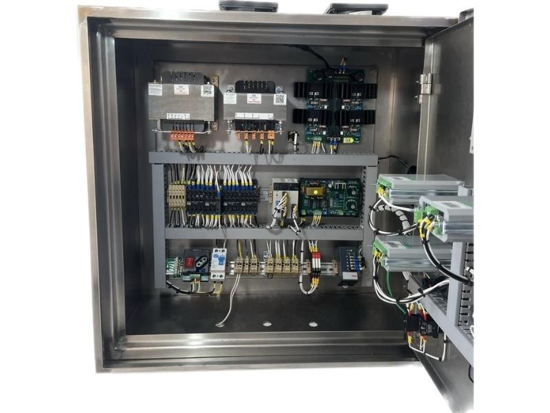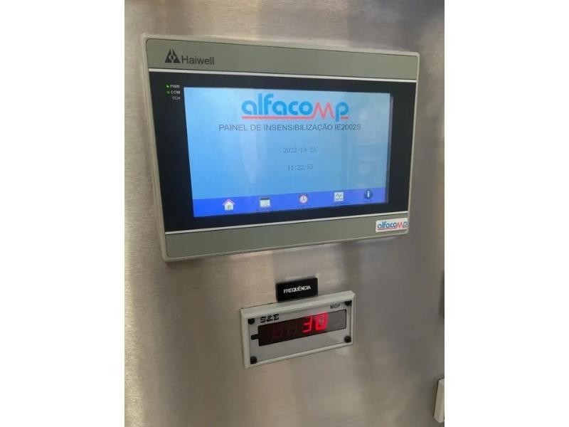 O insensibilizador IE2002 utiliza os módulos Alfacomp 2022 e 9801, consagrados pelo mercado como a eletrônica mais utilizada na insensibilização de suínos. Um CLP com IHM controlam o sequenciamento do funcionamento do equipamento.