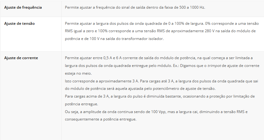 Além disso, monitora a corrente fornecida pelo módulo de potência, diminuindo a largura dos pulsos de chaveamento, de maneira a limitar a energia fornecida.