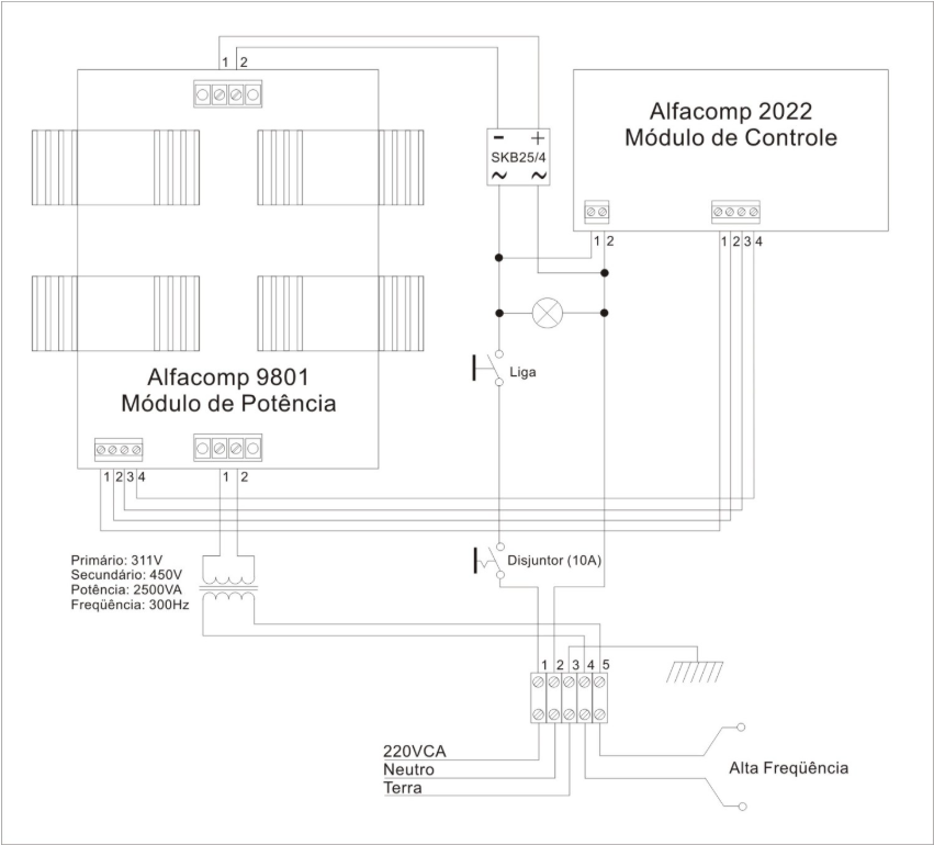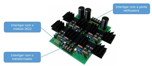 Este módulo transforma a tensão DC de 331 V em uma tensão alternada de formato quadrado e frequência e largura de pulsos comandados pelo módulo 2022.