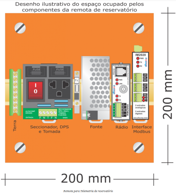 O módulo SW3300 tem as funções de seccionamento, proteção contra surtos e tomada. A fonte de alimentação S-25-24 fornece 24 VCC para a interface Modbus e para o rádio modem. A interface Modbus IM2020 possui duas entradas analógicas e duas entradas digitais onde podemos conectar o transmissor de nível, o transmissor de vazão e ainda um detector de invasão. A interface Modbus se comunica com a central de telemetria por intermédio do rádio modem RM2060.