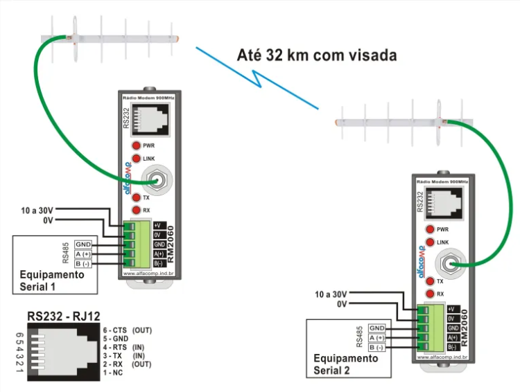 O transceptor RM2060 permite a comunicação wireless utilizando tecnologia Spread Spectrum na faixa dos 900 MHz podendo substituir milhares de metros de cabos de comunicação em ambientes industriais ruidosos. Utilizando comprovada tecnologia FHSS, que dispensa licença de operação junto a Anatel, o transceptor RM2060 estabelece comunicação entre computadores, CLPs e instrumentos diversos que possuem porta serial em padrão RS232 ou RS485 com taxas de 1200 a 115.200 bps. Alcance de até 32 km com visada.