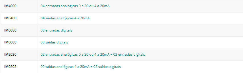 Protocolo: MODBUS RTU — mestre e escravo (IM0400, IM0008 e IM0202) escravo (IM4000, IM0080 e IM2020)