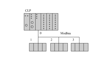 O protocolo Modbus define que o modelo de comunicação é do tipo mestre-escravo (ou cliente-servidor). Assim, um escravo não deve iniciar nenhum tipo de comunicação no meio físico enquanto não tiver sido requisitado pelo mestre. Por exemplo, a estação mestre (geralmente um PLC) envia mensagens solicitando dos escravos que enviem os dados lidos pela instrumentação ou envia sinais a serem escritos nas saídas, para o controle dos atuadores ou nos registradores. A imagem abaixo mostra um exemplo de rede Modbus com um mestre (CLP) e três escravos (módulos de entradas e saídas, ou simplesmente E/S). Em cada ciclo de comunicação, o CLP lê e escreve valores em cada um dos escravos.