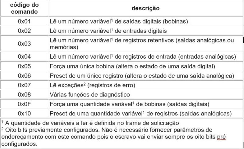 A tabela a seguir apresenta os principais comando (funções) do protocolo Modbus.