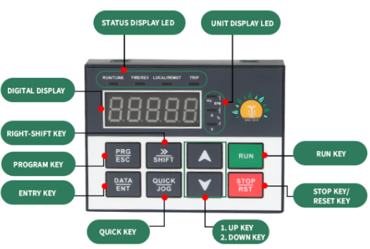 Circuito de controle: Ele consiste em uma unidade microprocessada e executa várias funções como controle, ajuste de configurações do inversor, condições de falha e interfaces de comunicação utilizando protocolos industriais. Ele recebe um sinal de feedback do motor como referência de velocidade atual e, consequentemente, regula a relação entre tensão e frequência para controlar a velocidade do motor.