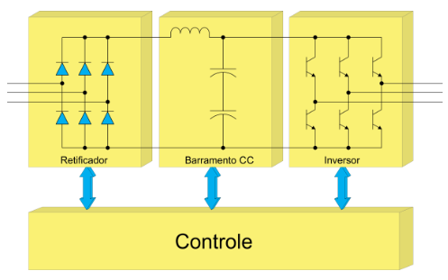 Barramento CC: A alimentação CC da seção retificadora é entregue ao barramento CC. Esta seção consiste em capacitores e indutores para suavizar contra ondulações e armazenar a energia CC. A principal função do barramento CC é receber, armazenar e fornecer energia CC.