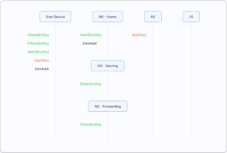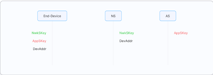 NwkSKey – a chave de sessão de rede é usada pelo dispositivo final e pelo servidor de rede para calcular e verificar o código de integridade da mensagem (MIC) de todas as mensagens de dados para garantir a integridade da mensagem. O NwkSKey também é usado para criptografar e descriptografar cargas úteis com comandos MAC.