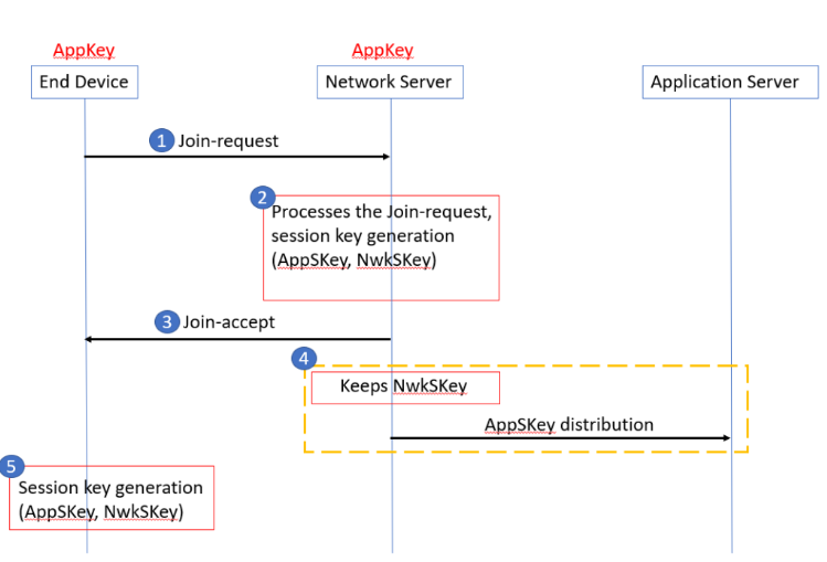 Observação: O AppKey e o NwkKey nunca são enviados pela rede. As etapas a seguir descrevem o procedimento de ativação Over-The-Air (OTAA).