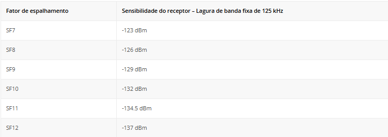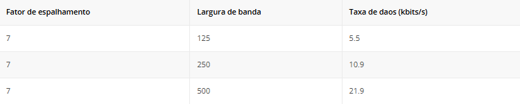 A tabela a seguir apresenta taxas de bits calculadas com SF7 e Taxa de Codificação (CR) = 1 para larguras de banda de 125, 250 e 500 kHz.