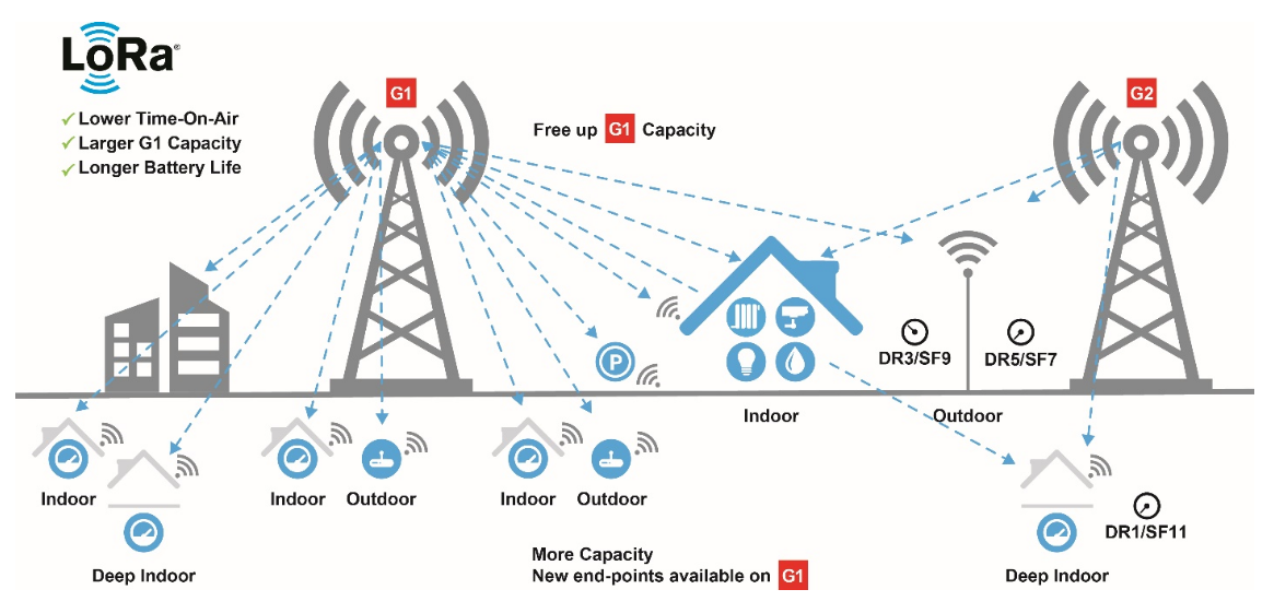 O ADR pode otimizar o consumo de energia do dispositivo e, ao mesmo tempo, garantir que as mensagens ainda sejam recebidas nos gateways. Quando o ADR estiver em uso, o servidor de rede indicará ao dispositivo final que deve reduzir a potência de transmissão ou aumentar a taxa de dados. Os dispositivos finais que estão próximos dos gateways devem usar um fator de espalhamento mais baixo e uma taxa de dados mais alta, enquanto os dispositivos mais distantes devem usar um fator de espalhamento alto porque precisam de uma taxa de utilização de link mais alto.
