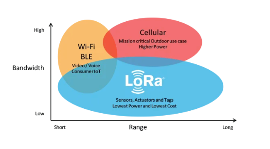 LoRaWAN é adequado para transmitir pacotes de dados pequenos (como dados de sensores) em longas distâncias. A modulação LoRa permite um alcance de comunicação significativamente maior com larguras de banda mais baixas do que outras tecnologias concorrentes de transmissão de dados sem fio. A figura a seguir mostra algumas tecnologias de acesso que podem ser usadas para transmissão de dados sem fio e seus intervalos de transmissão esperados versus largura de banda.