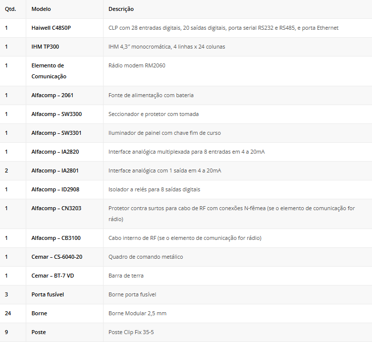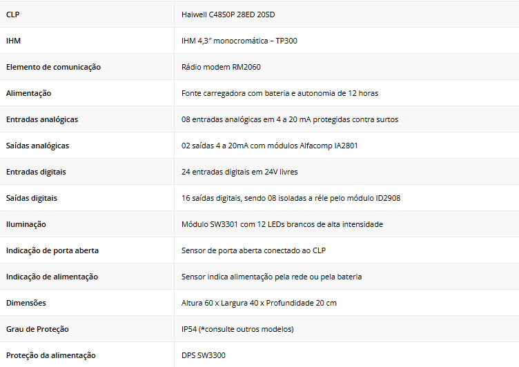 Baseado no CLP Haiwell modelo C48S0P, o painel apresenta alto índice de integração, modularidade, facilidade de manutenção e protocolo MODBUS RTU mestre e escravo, resultando em uma montagem de alto desempenho e baixo custo.
