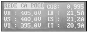 Apresenta o valor da tensão e corrente das fases R, S, T e o fator de potência da elevatória.