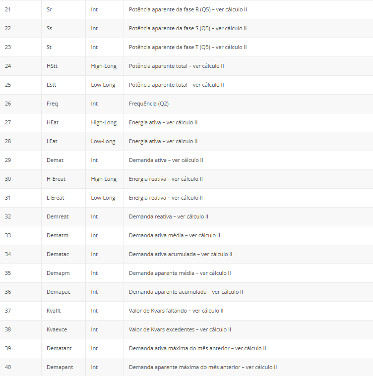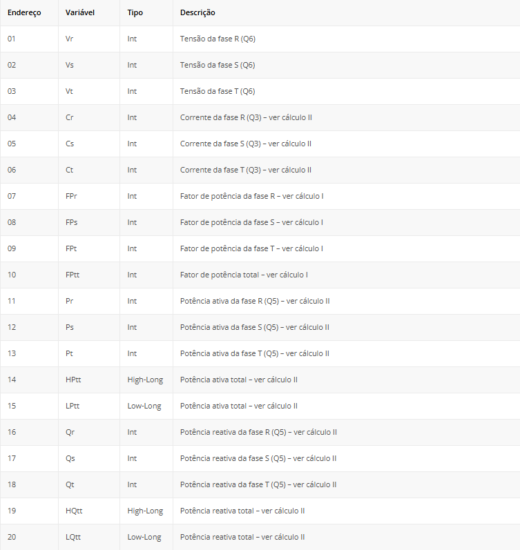 São os seguintes os parâmetros básicos de leitura Modbus do multimedidor, utilizando a função 0x04 (read input registers).