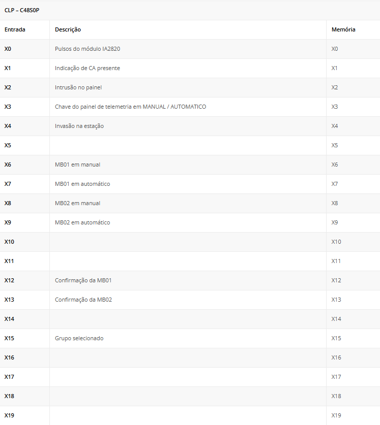A memória Cond_Op1 contém 16 bits que são utilizados como status de funcionamento da estação, cada bit identifica uma ocorrência, sendo 0=false e 1=true.