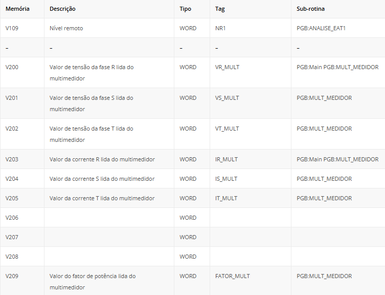 As grandezas elétricas como corrente, tensão e fator de potência, são adquiridas pelo multimedidor de grandezas elétricas modelo ST9250R que se comunica com o CLP pela porta RS485 do CLP em protocolo MODBUS. Nesta porta, o CLP está configurado como endereço 1, 19200 bps, 8 bits, 1 stop bits e sem paridade. O multimedidor assume o endereço 1.