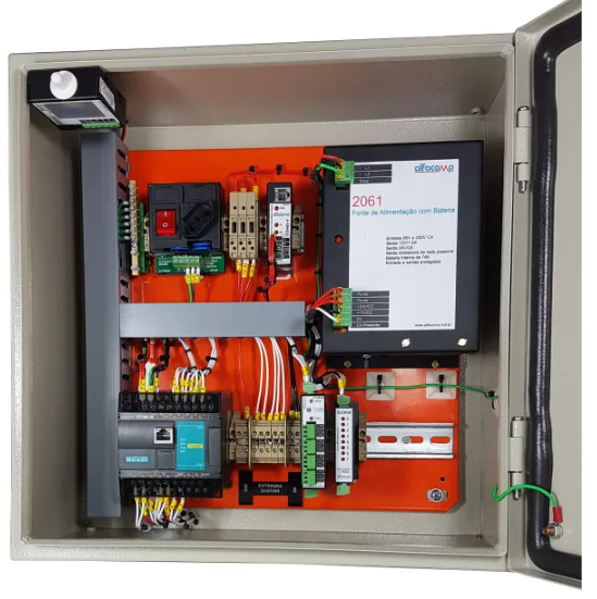 Fonte de alimentação – Transforma a tensão alternada da rede nas tensões CC usuais, geralmente 24 VCC e gerencia a carga da bateria para a operação na falta de energia da rede;