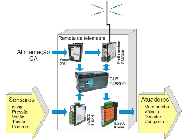 A figura abaixo apresenta uma composição típica de uma remota de telemetria. No exemplo mostrado, a remota de telemetria é composta por: