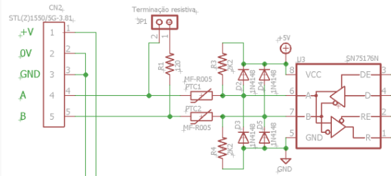 O circuito parcial a seguir, apresenta as conexões internas da porta RS485. Observe-se que os sinais A e B da conexão seria RS485 são protegidas contra sobre tensões por diodos e termistores. O Jumper JP1 conecta a terminação resistiva de 120 ohms. Esta terminação deve ser utilizada nas pontas da rede RS485. Consulte as normas EIA para saber mais sobre este padrão serial.