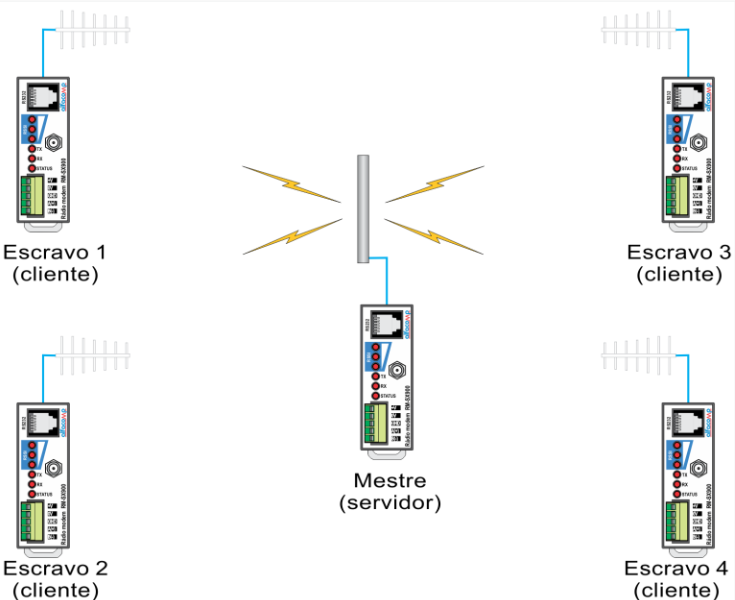 Sistemas Ponto Multiponto possuem uma estação central (Servidor), que controla a comunicação, e diversas outras unidades chamadas remotas (Clientes). Programando os transceptores com diferentes configurações de canal e identificador de sistema, podemos criar redes diferentes dentro de uma mesma área.
