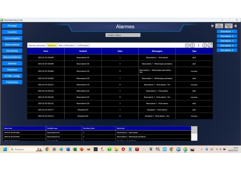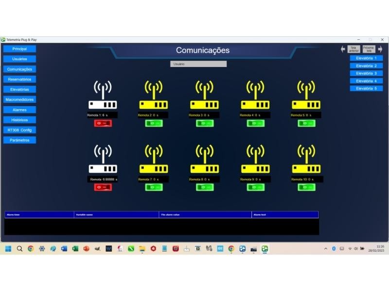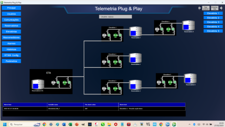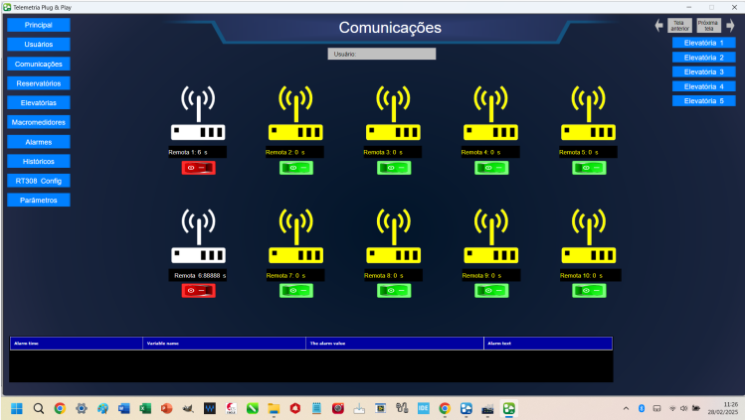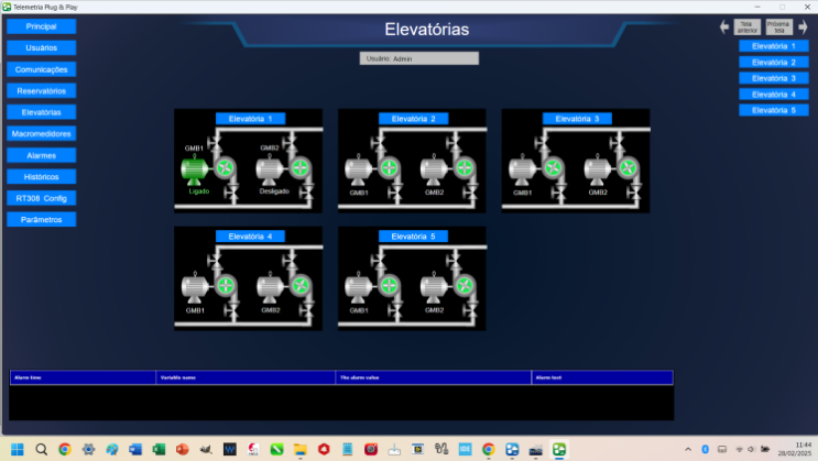 - Uma tabela de alarmes presentes na base da tela (no exemplo acima mostrando Pressão baixa na sucção da elevatória).