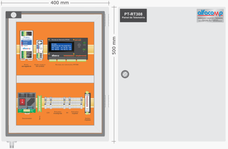 O painel de telemetria PT-RT308 é baseada na remota de telemetria RT308. Os quadros apresentam alto índice de integração, modularidade, facilidade de manutenção, remota com protocolo MODBUS RTU, resultando em montagens de alto desempenho e baixo custo. Os equipamentos destinam-se ao uso em instalações de saneamento tais como reservatório e elevatórias de água e esgoto, pontos de macromedição.