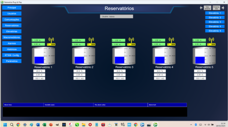 Esta tela permite visualizar simultaneamente os reservatórios do sistema, seus respectivos níveis e setpoints de liga e desliga do bombeamento.