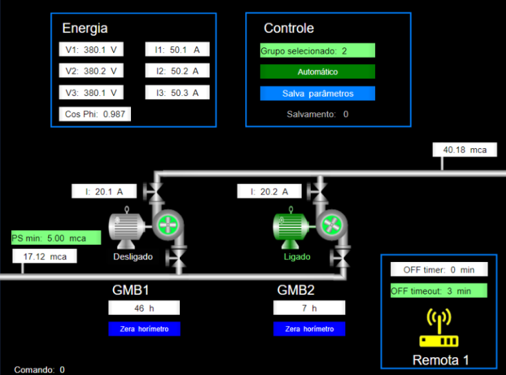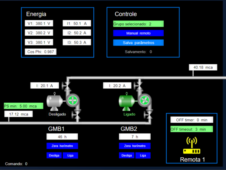 Durante o funcionamento Manual remoto podemos ligar e desligar os grupos de motobombas independente das rotinas automáticas. Em Manual remoto os botão de liga e desliga dos GMBs ficam visíveis.