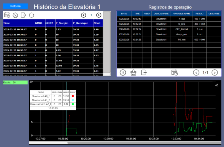 - Registros de operação mostrando as alterações de valores e comandos realizados pelo operador.