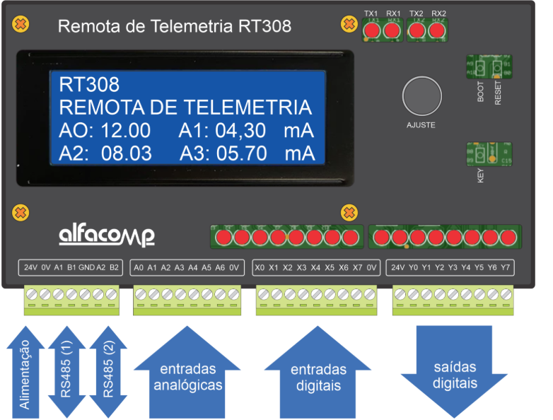- Grandeza física lida na entrada analógica: metros, %, mca, l/s, m3/h, oC, kg, V, A
