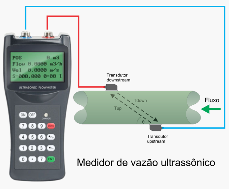 Os medidores ultrassônicos de vazão medem o tempo de trânsito dos pulsos ultrassônicos que se propagam com e contra a direção do fluxo. Essa diferença de tempo é uma medida para a velocidade média do fluido ao longo do caminho do feixe ultrassônico. Usando os tempos de trânsito absolutos Tup e Tdown, tanto a velocidade média do fluido v quanto a velocidade do som c podem ser calculados. Usando esses dois tempos de trânsito, a distância entre os transdutores de recepção e transmissão L e o ângulo de inclinação α , se assumirmos que o som tem que ir contra o fluxo ao subir e ao longo do fluxo ao retornar para baixo, pode-se escrever as seguintes equações a partir da definição de velocidade: