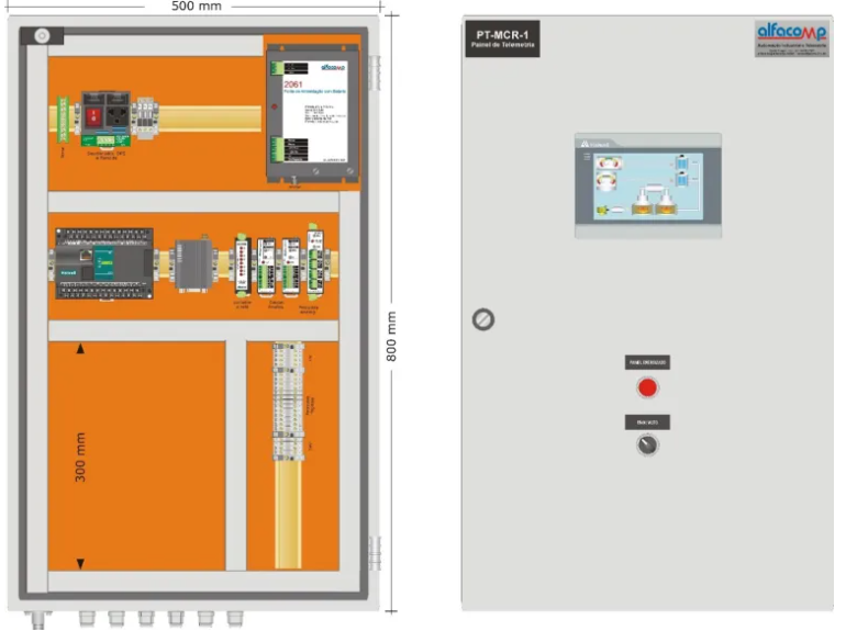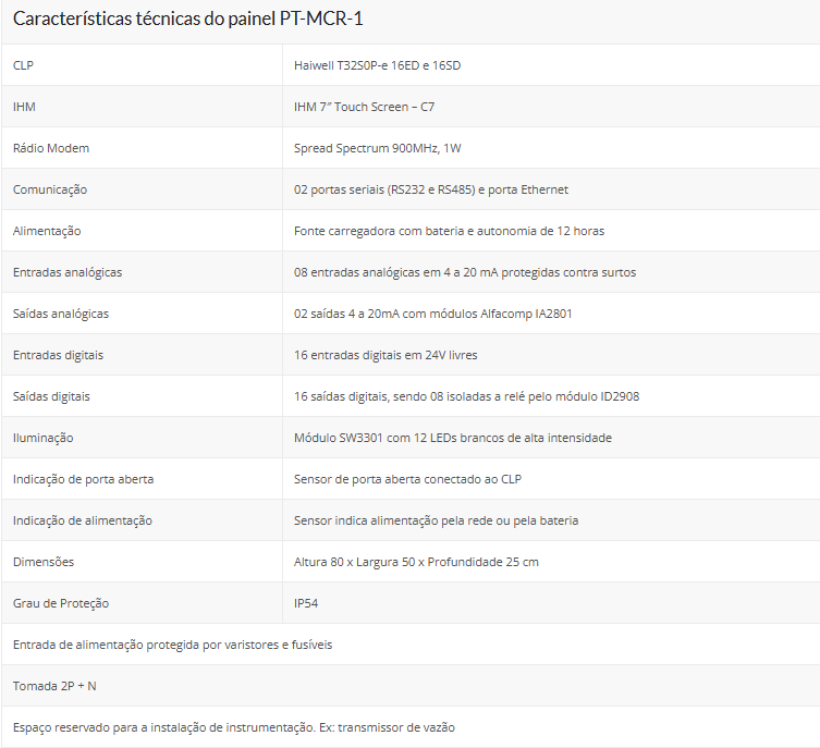 O painel de telemetria PT-MCR-1 é baseado no CLP Haiwell Série T, modelo T32S0P-e. Possui IHM Touch Screen de 7” para monitoramento e parametrização local. O espaço interno deixado livre permite instalar instrumentos como transmissores de vazão e outros instrumentos e/ou acessórios.