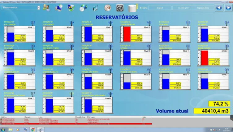 Esta tela mostra os reservatórios, apresentando níveis em percentual, metros de coluna d’água e metros cúbicos de cada reservatório.