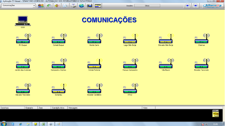Todas as telas são dotadas de uma janela de alarmes que apresenta os alarmes presentes identificando a estação, o horário e o motivo gerador do alarme. O operador deverá reconhecer o alarme e esse reconhecimento é registrado no histórico de alarmes.