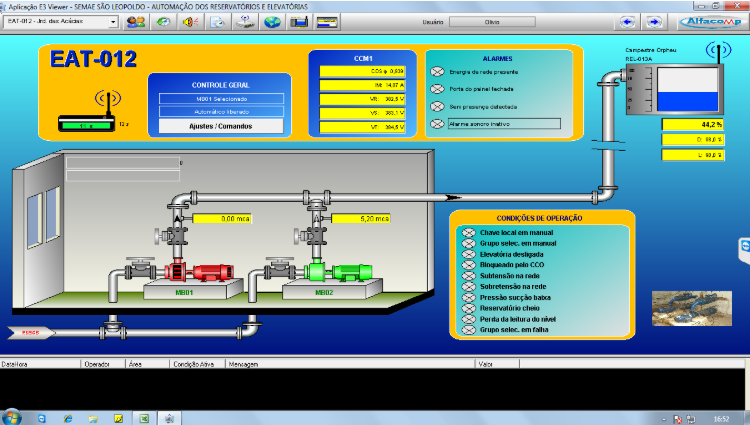 Nas telas de elevatória, os operadores monitoram pressões de recalque e sucção, status de operação das bombas, parâmetros elétricos, alarmes e condições operacionais. Através dessas telas se pode intervir e alterar a forma de operação da estação de bombeamento.