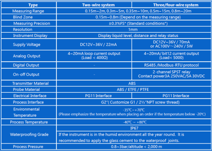 *Observação: A distância máxima de medição do medidor de nível ultrassônico é afetada pelas condições operacionais. Os dados da tabela acima são apenas para referência.