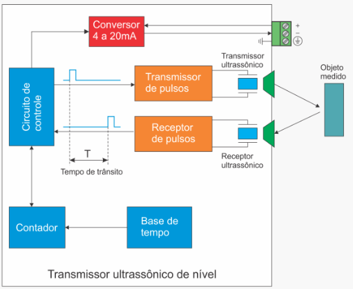 O tempo de viagem do pulso ultrassônico do sensor até a superfície do líquido e de volta para o sensor é calculado e dividido por dois Conhecendo a velocidade do som para as condições de temperatura e pressão, o equipamento transmissor de nível calcula o nível. O resultado final da unidade de medição pode ser centímetros, pés, polegadas, etc.