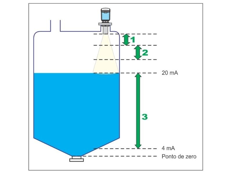 O nível é finalmente convertido em sinal 4 a 20mA, sendo o valor de 4mA indicador do nível mínimo e o 20mA indicador do nível máximo.