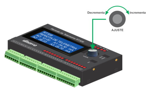 O botão de ajuste é um encoder rotativo que possibilita o incremento ou decremento de variáveis, além de permitir a rolagem das linhas do display. Além disso, o botão de ajuste funciona como uma chave de pressão (push button), permitindo alternar entre os modos de funcionamento do display, confirmar os valores ajustados e avançar para o próximo campo a ser modificado.