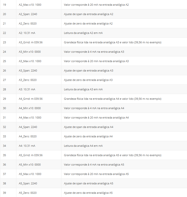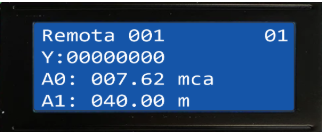 - A0: 007.62 mca indica que a entrada analógica A0 lê 7,62 metros de coluna d’água.
