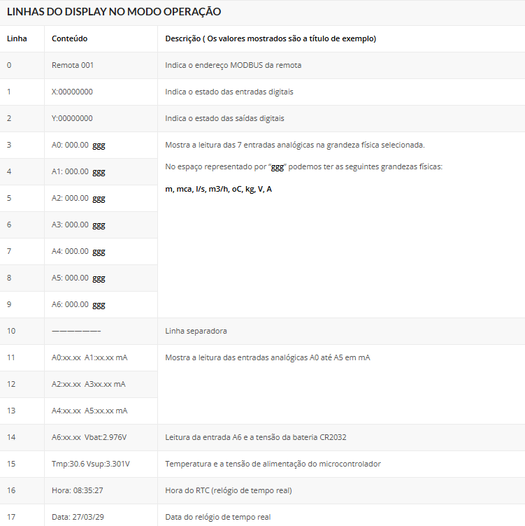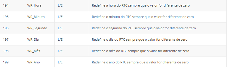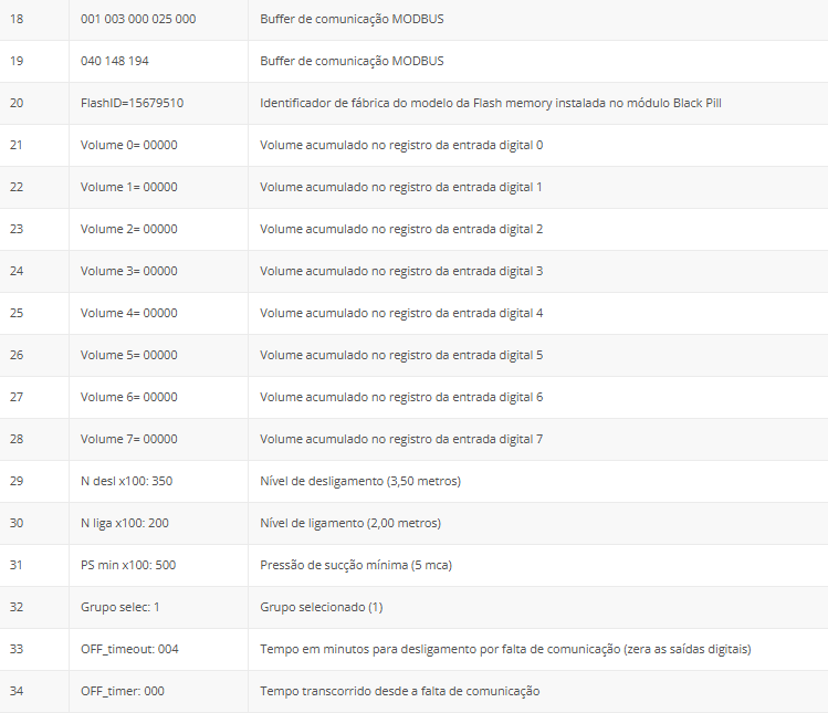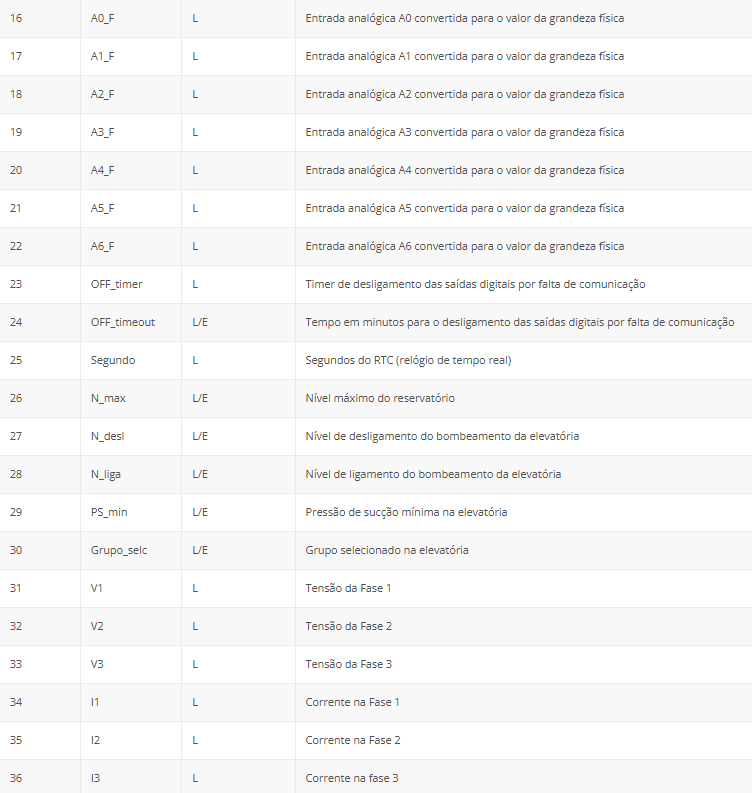 A tabela a seguir apresenta os endereços e variáveis de comunicação da remota no protocolo Modbus.
